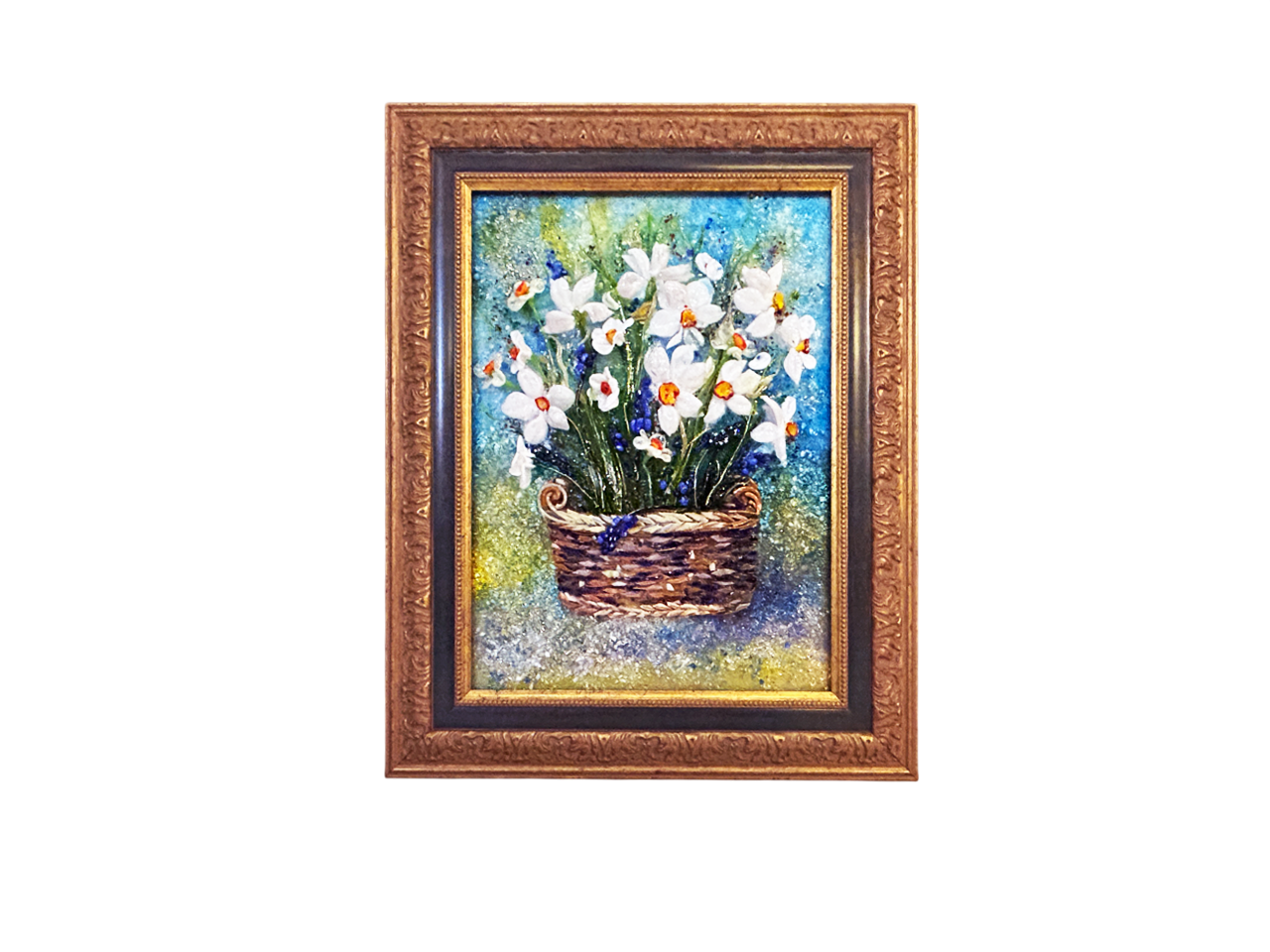 Она создает эффект объёмного живописного полотна, где цветы нарциссов и корзинка выполнены из стекла