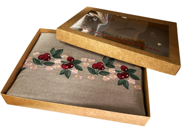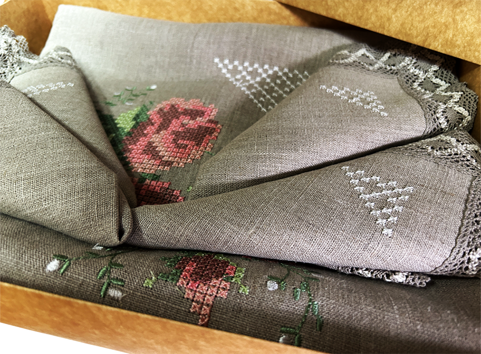 Этот столовый комплект из натурального льна с вышивкой цветка розы является продуктом белорусского народного промысла и включает в себя скатерть 143х143 см и 6 салфеток 30х30 см. Весь комплект выполнен из 100% льна.