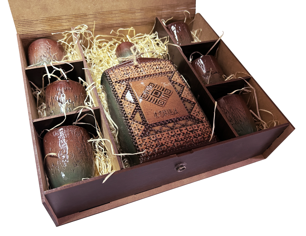Керамический набор «Сонца» представляет собой продукт белорусских народных художественных промыслов, включающий керамическую бутылку и рюмки с традиционным орнаментом, упакованные в деревянный футляр. Это изделие ручной работы, типичное для сувенирной продукции Беларуси.