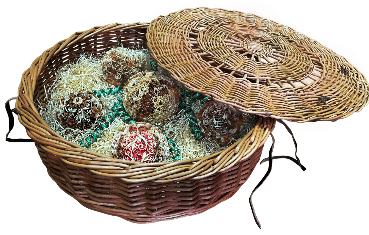 На изображении представлена большая плетёная декоративная корзина из лозы с крышкой, фиксирующейся при помощи кожаных шнуров, наполненная декоративными шарами, выполненными в технике «Сожская скань».