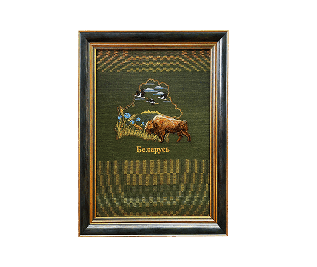 Это произведение искусства, выполнено в технике вышивки, изображает зубра, который является национальным символом Беларуси. Этот сувенир или предмет декора, посвященный Беларуси и ее природе.