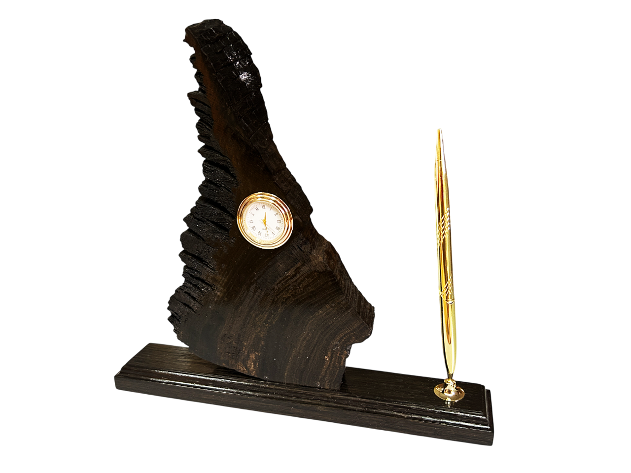 В его основе лежит массивный фрагмент мореного дуба, чей глубокий, почти антрацитовый цвет и неповторимая фактура рассказывают историю веков. Рельефный край дерева напоминает очертания скалистых гор или древних артефактов, подчеркивая первозданную красоту материала.