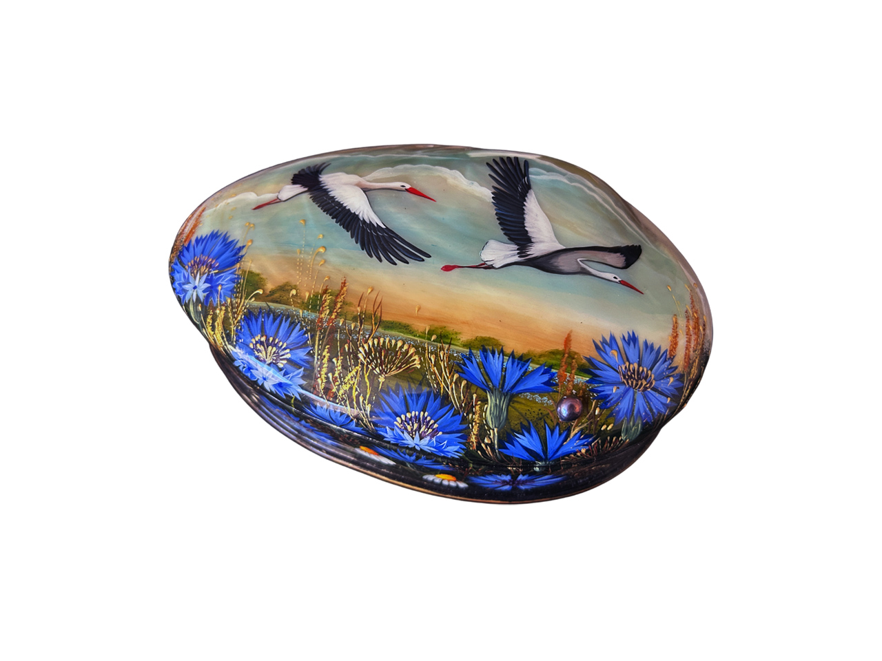 Шкатулка с авторской ручной росписью на перламутре в технике лаковой миниатюры (многослойные прописки маслом, темперными красками по слоям лака), на примере белорусского сюжета — аисты, летящие над полем васильков.